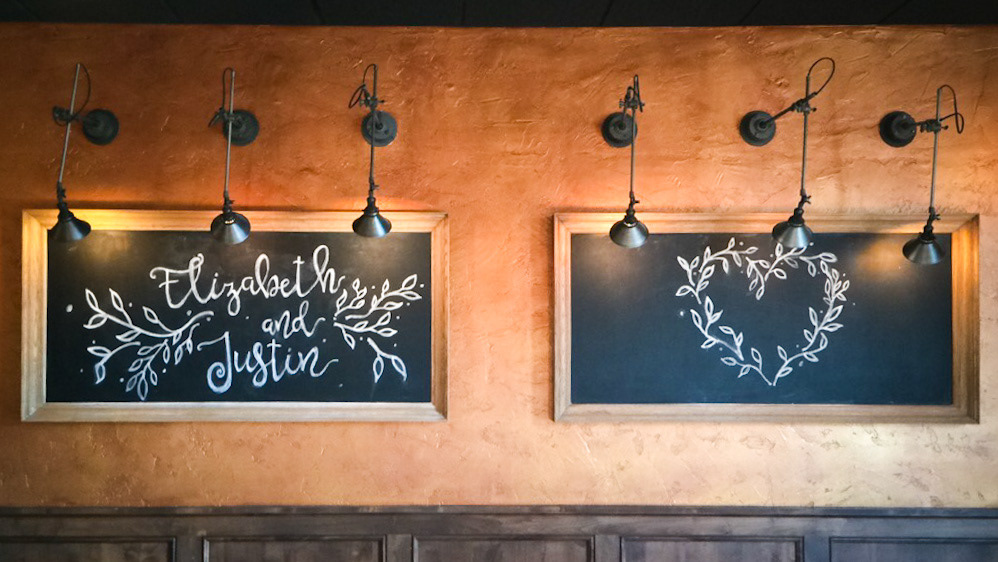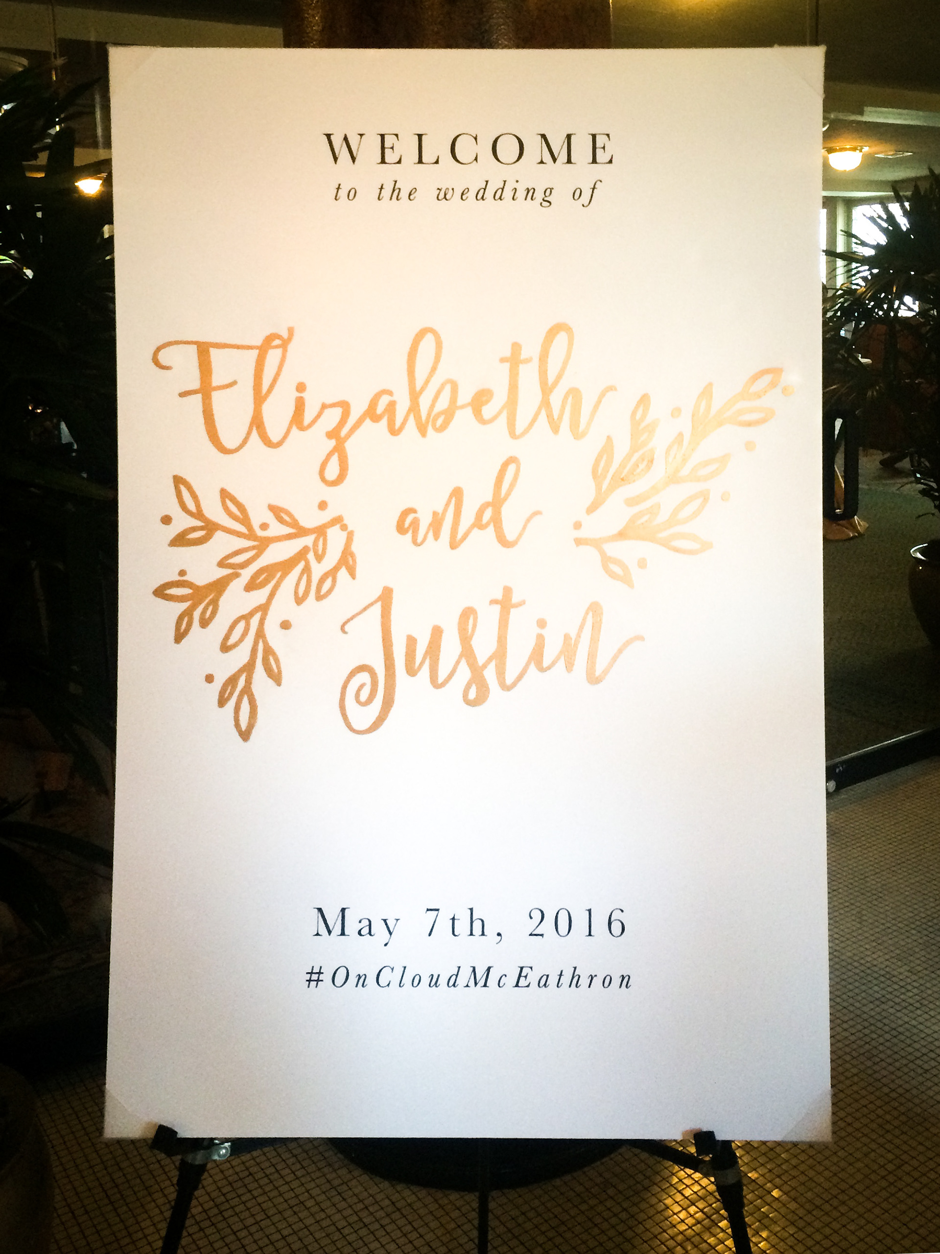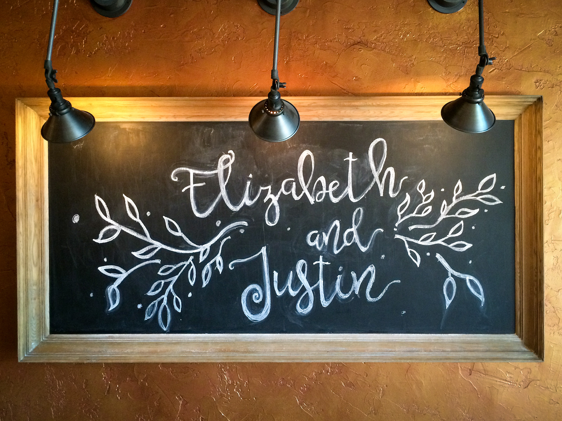 I met Elizabeth working as servers together at The Rumpus Room so, when she wanted some creative made for her rehearsal dinner that would take place there, I was on board! She also needed signage for her wedding as well. For her creative, she showed me the hand-lettered aesthetic she was going for and I tied that look together cohesively from rehearsal dinner to wedding. This project was really different than my day-to-day design. It involved doing hand-lettered chalk boards and manually adding a gold emboss to her signage to achieve the look she wanted. She used gold accents throughout her entire wedding so, the embossing really added an extra sparkle.